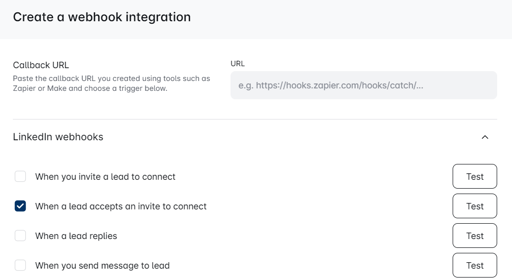 In the Test section, paste the Callback URL Zapier generated earlier.